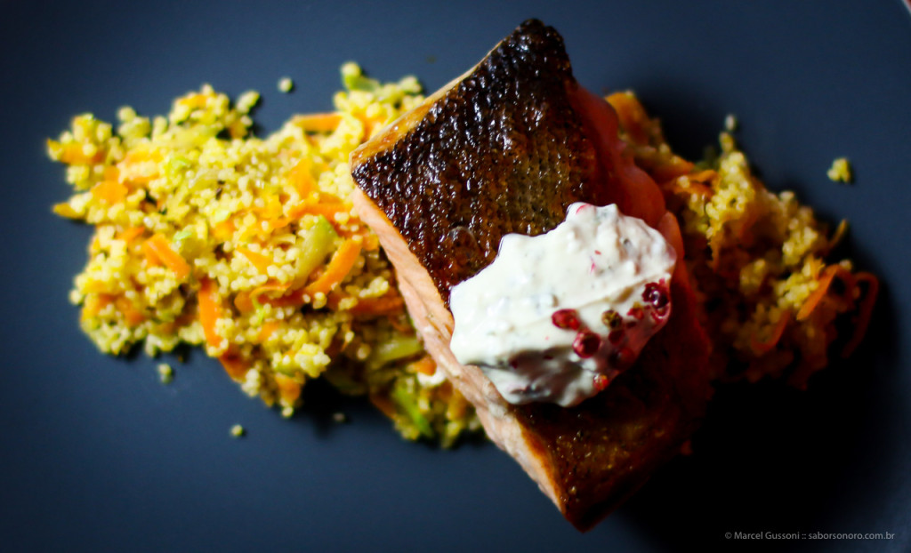 Salmão com molho de cream cheese e couscous de legumes