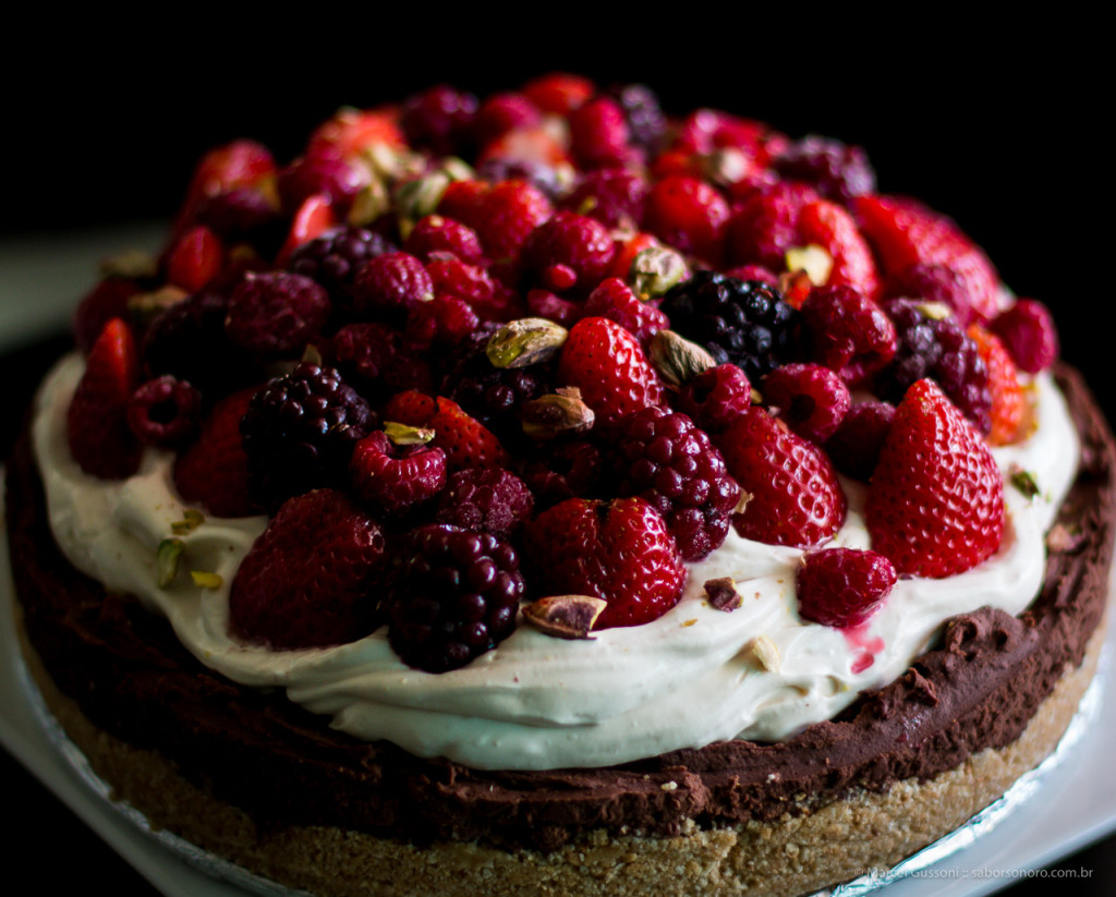 Torta de ganache, frutas vermelhas e pistache