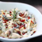 Na mesma frigideira, coloque mais um pouco de azeite, refogue o alho, ervilha e o champignons rapidamente, acrescente a massa cozida e misture.